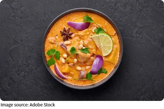 We serve Thai curry chicken with fragrant jasmine rice. The creamy sauce clings beautifully to the grains, making every bite rich and satisfying. For a more interactive meal, everyone can scoop the curry over their own rice, mixing flavors to taste.