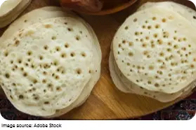 Baghrir, also known as Moroccan crêpes, are soft, spongy pancakes full of tiny holes that perfectly soak up honey, syrup, or jam.